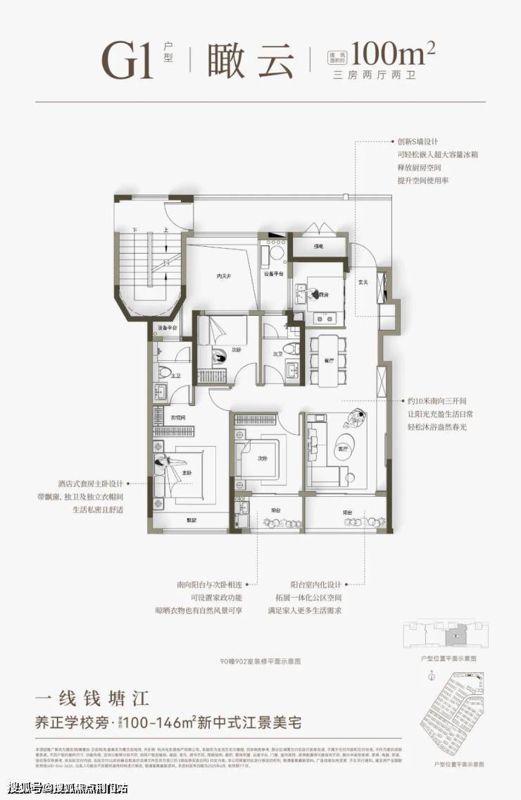 建面约100㎡户型,三开间朝南,S墙和可变开放式厨房,很对年轻人的居住口味,站在楼上能够对中式园林景观一览无余。