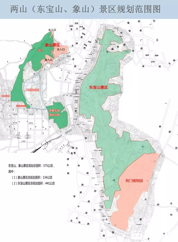 其实早在2018年,荆门市园林局就发布了东宝山、象山“两山”建设安排。2020年—2022年完成东宝山景区建设(其中:2020年完成东宝山景区出入口广场、通道及周边停车场建设;2021年完成东宝山景区道路、供电供水等市政基础设施及配套建设;2022年完成东宝山景点景观建设)。区域规划整治范围北抵月亮湖广场、南达荆门市植物园、西至焦柳铁路、东临石化厂区,总面积约441公顷。