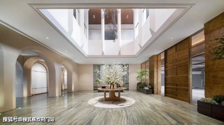 项目东方殿堂级别的公区设计,社区大堂中庭超7米挑空打通双层视野,12座拱形廊柱阵列环抱艺术装置,构成一座雅奢美学殿堂。