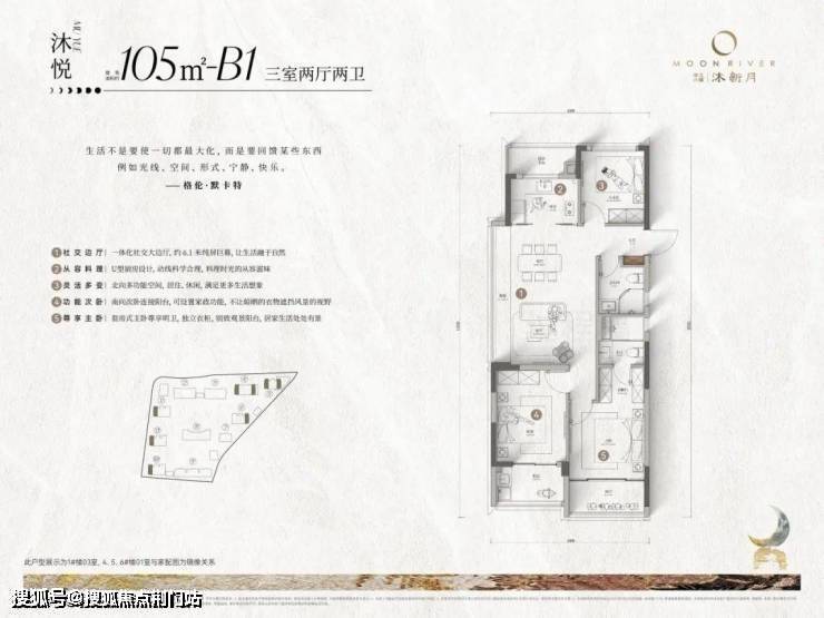 约105㎡有两款,我称之为“横竖双王炸”:一款是“四开间南小户型”,每个房间都向阳,还是准双套房。另一款是少见的边套小户型,自带约6.1米大边厅。