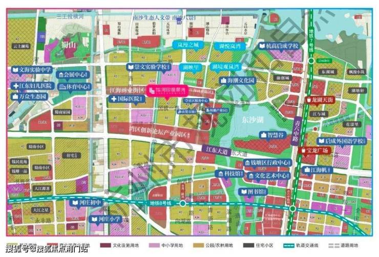 江海之城的规划有一点和钱二很像,钱二是由三堡五堡七堡一个个TOD串联起来的,江海之城也一路是「TOD+公园城市」的横向轴带,青六中路站等4组TOD集群,拱卫着板块核心的河印观翠湾。