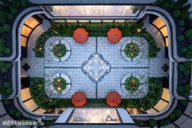 下沉式庭院遵循“秩序美学”,水花飞溅,如珠玉散落,在阳光下闪烁晶莹,为庭院注入灵动之韵。