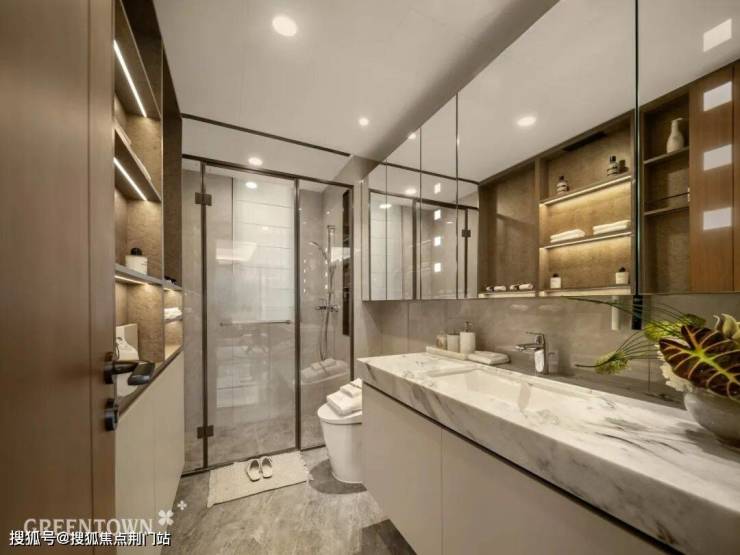 宽幅叠瀑水景,搭配汉白玉奢石海棠雕塑,水流潺潺、光影交织。约7米高宝格丽绿奢石景墙,维纳灰石材为框,玻利维亚黑奢石嵌入“点睛”……且行且赏,每一眼皆怦然心动。