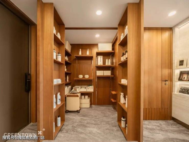 自地下车马院返家,踏入呈对称格局的光厅,其顶部“书简”造型的延展设计,以及随处可见的海棠元素,皆使人出入时步履沉稳,仪式感自然而生。