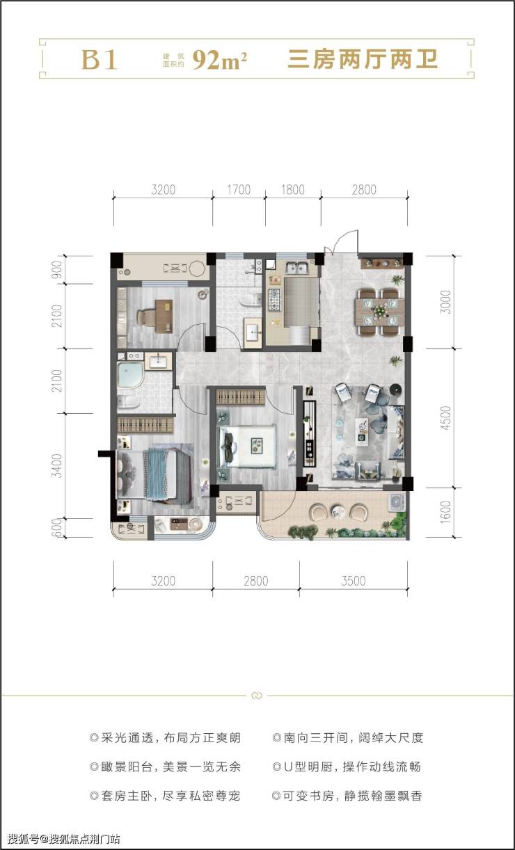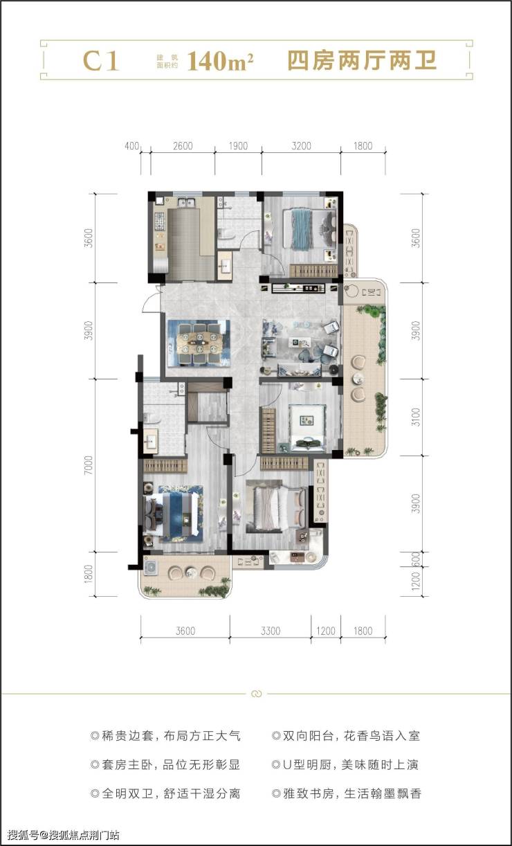 户型细节:瞰景阳台的转角皆优化为圆弧形设计,不仅体现了柔和的美感、也进一步提升了产品独特品质感。