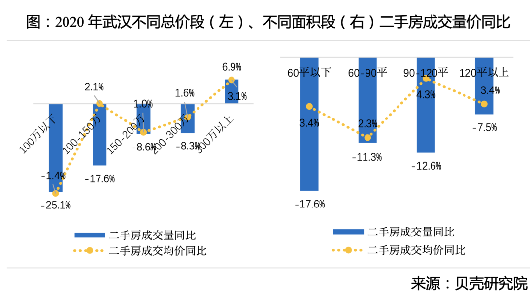 3、在价格上,武汉300万以上的房子同比去年卖得最火,房价涨势最猛,反而100万以下的房子最惨,成交量竟然下跌了25.1%。
