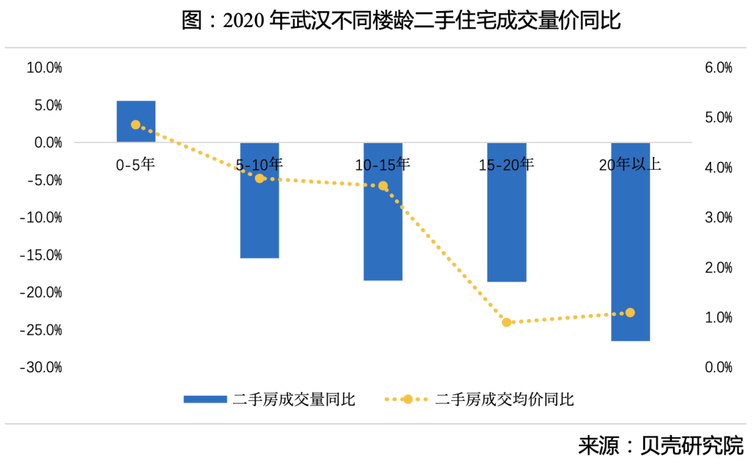 2、房龄对房子的影响非常大,我们看到,武汉0-5年的次新房卖得较好,20年以上的房子成交量暴跌了26.5%。