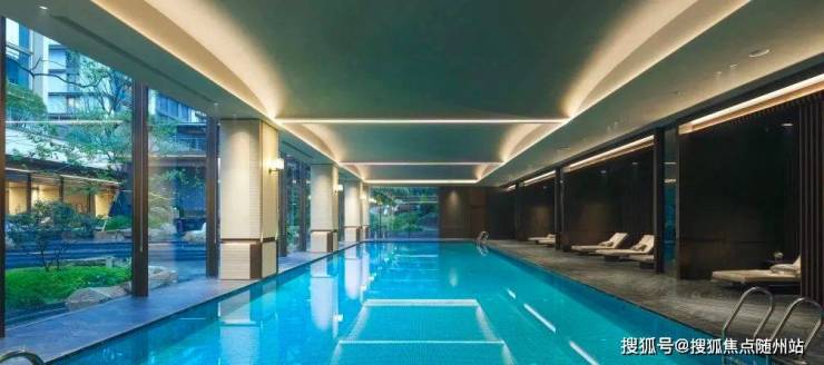 恒温泳池长约25米,采用双面大落地窗设计,将社区园林的绿意引入室内,池畔铺陈柔软沙发,创造出院落星级酒店的休闲体验。泳池旁的水吧与书吧连成开放式场域,形成多功能的社交空间。