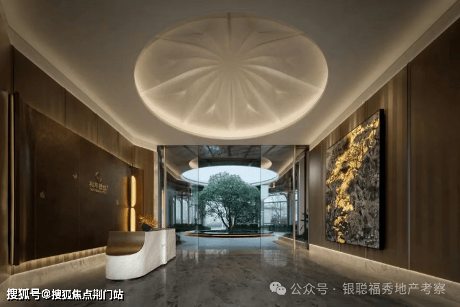步入门庭,映入眼帘的是由11根高5米多的弧形立柱构成的壮阔空间。这些立柱巧妙环绕,撑起了一个宏伟的藻井,其吊顶采用了精致的透光云石,彰显非凡的气派与匠心独运的设计。中心一棵古桂挺拔繁茂,恭候业主荣耀归府。