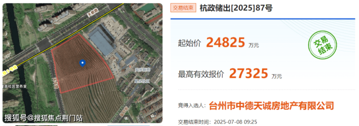 杭政储出[2025]87号地块,即临平副城星桥区块控规LP0801-R21-41B(C70)地块位于临平区,东至地块,南至地块,西至天华路,北至天都路南侧绿带。土地主用途为普通商品住房用地(二类),出让面积33.852亩,出让年限70年,容积率为1.0<容积率≤1.1,成交价为27325万元。