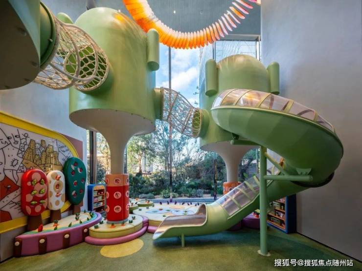 楼下的架空层,项目腾出空间做了一整层的超大童玩空间。整体面积超过480平米,运用大面积的落地玻璃窗,让这个区域变的更加透亮。让绿意充分渗入,实现近距离、无遮挡观景视野。