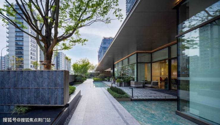 通过建筑退让,武珹云府还营造了一条沉浸式的景观休闲街区,曲折的水系、露天摆放的座椅、翠绿的植株交融于一体,将外部道路和建筑互相咬合在一起,城市微度假的气息冲击着每一个路人。