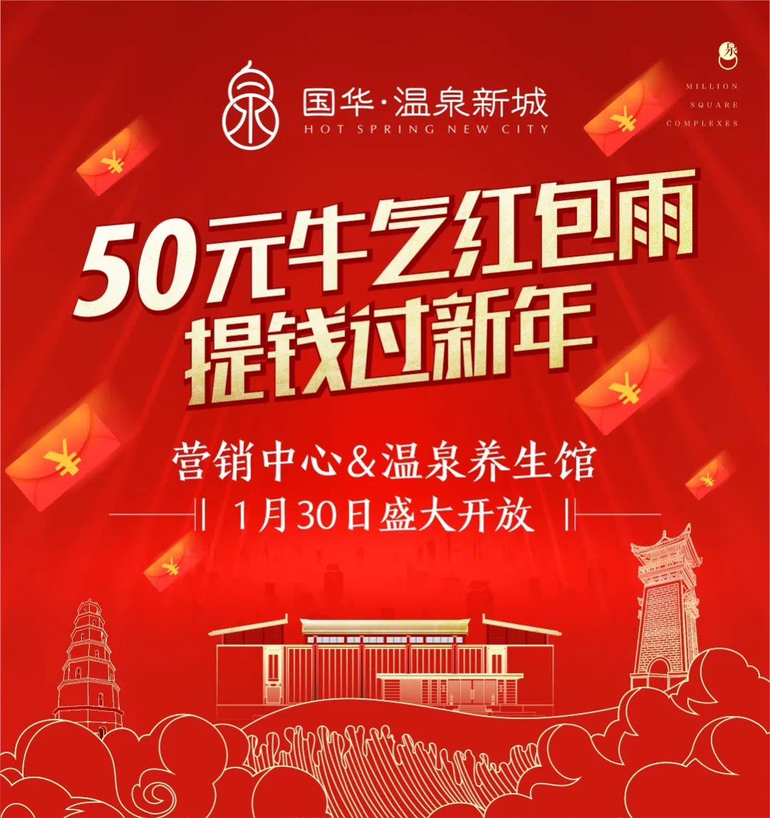 特别提示:1月30日国华·温泉新城营销中心开放日当天到现场兑奖,除了“50元现金红包”还有更多惊喜活动和精美好礼相送哦~心动不如行动!还在等什么啦!赶紧去抢红包、泡温泉呀~