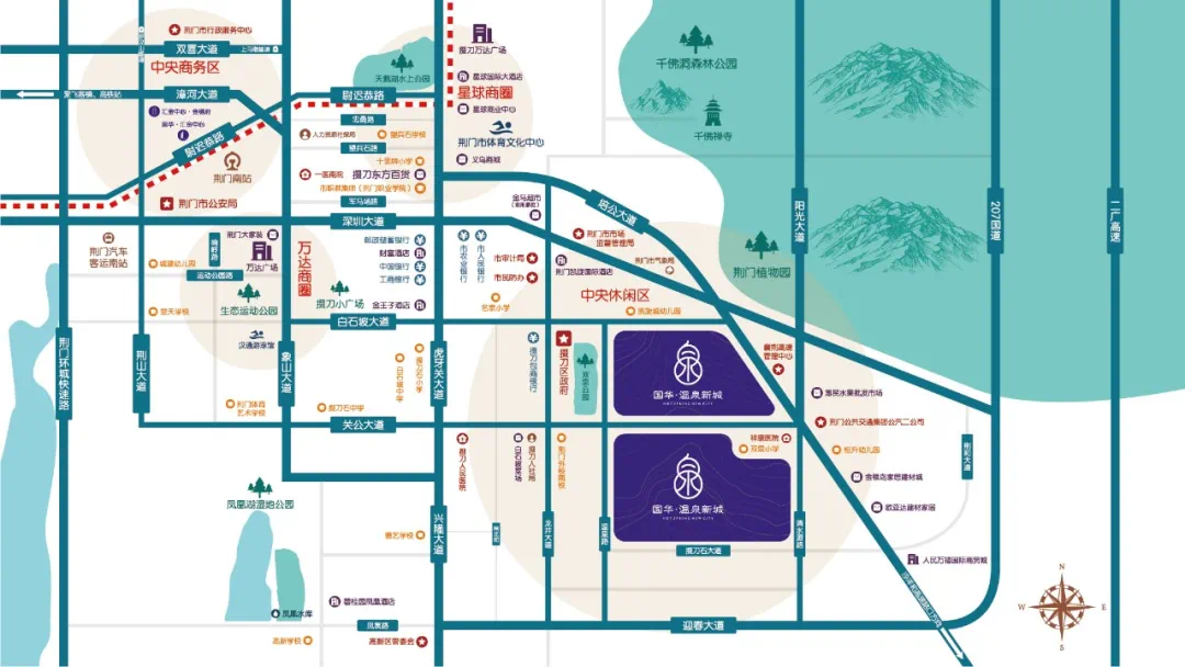 国华·温泉新城位于荆门市掇刀区政府旁·双泉公园东,6路、10路、28路等多分布周边,交通便利;周边有星球商圈、万达商圈汇集,悦享吃喝玩乐购一站式丰盈生活;荆门一医南院,掇刀人民医院等分布周边;附近还有双泉小学、名泉小学、掇刀石小学,荆门外国语学校(南校),白石坡中学、掇刀高中等,选择面广,让孩子赢跑未来。