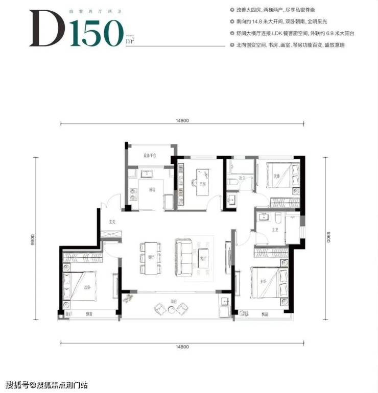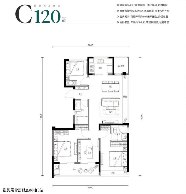 再往上,是约120㎡的四房两卫,三房朝南连双开间大阳台+约6米边厅,最适合年轻的二孩家庭进阶改善。
