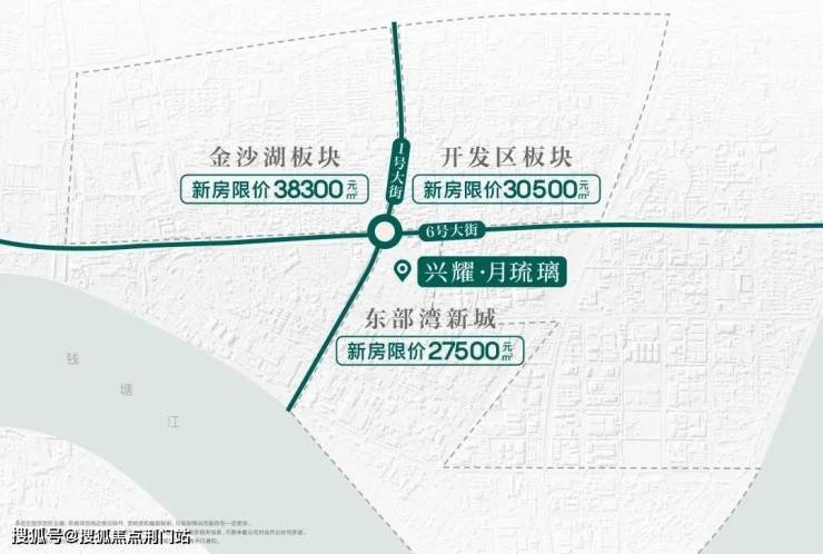 又因杭州限价以路为界,下沙1号大转盘数百米内,神奇地形成了3个限价梯度:38300元/㎡的金沙湖、30500元/㎡的开发区,27500的元/㎡东部湾新城。