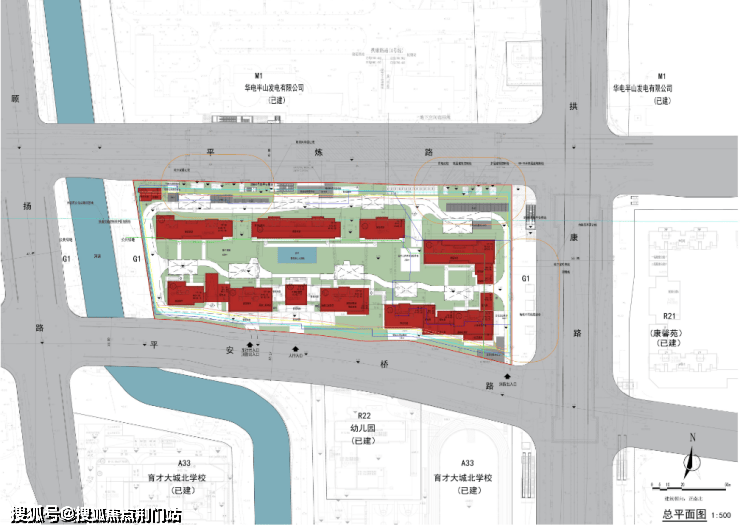 项目的主要出入口位于南面的平安桥路,从这里进到小区内部有泳池、景观构架、集中绿地等配套。