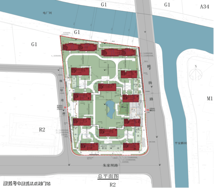 项目的出入口位于东面的顾杨路和西面的规划道路。其中东面的主要出入口位置坐了小区门厅、景观构架、下沉式庭院和景观水系,详细的方案效果待二次深化。