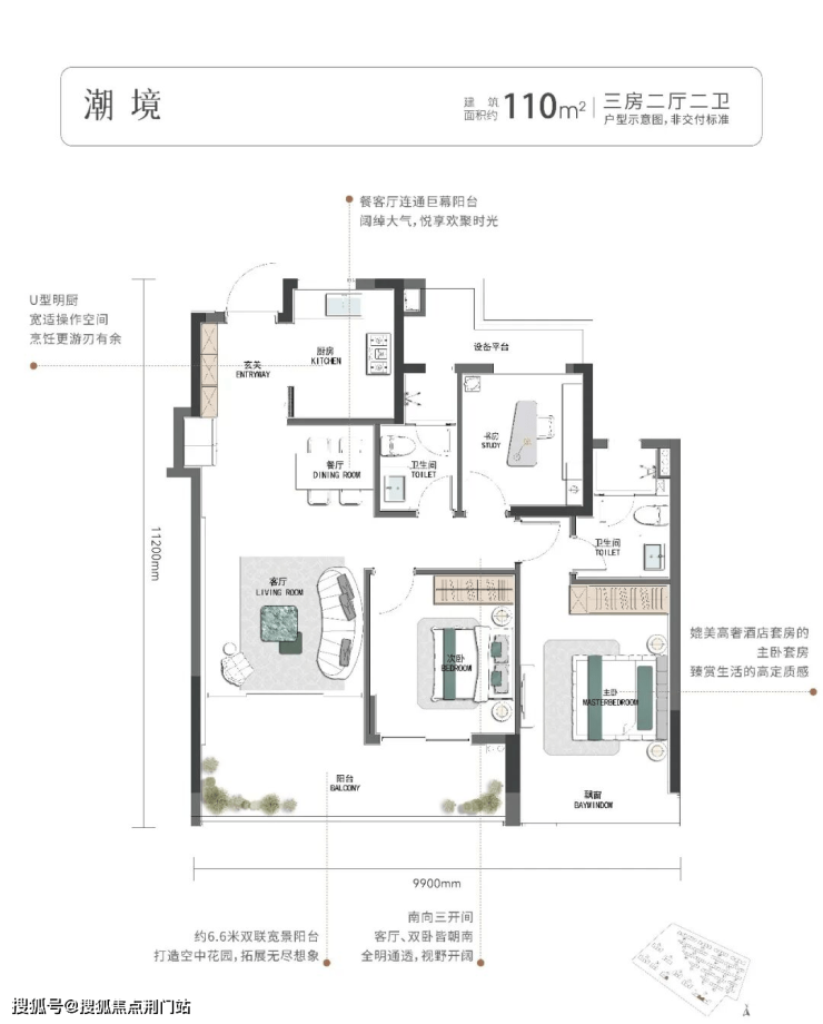 建面约110㎡的三房两厅两卫户型,最大的亮点在于南向大面宽与双联阳台的设计。