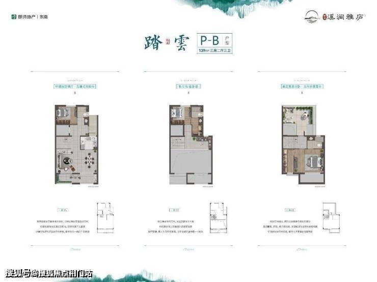 以建面约139方的排屋为例,总共打造了三层墅居空间,格局方正、南北通透,让住户充分享受到立体私密的空间感。