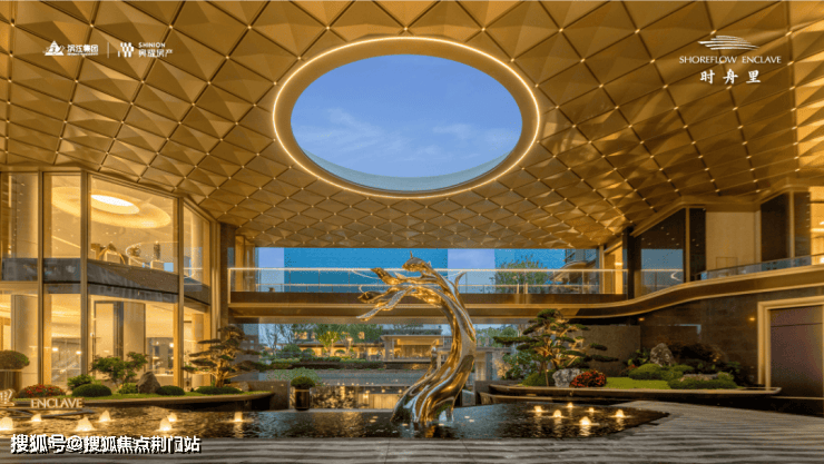 GAD大师张微以“科技+生态”为设计理念,将未来感弧线融入城市肌理:70米宽、9米高的鎏金天幕入口采用偏置大堂设计,顶部圆形镂空让光线穿透,将社区立体花园与城市界面自然衔接,形成“你站在桥上看风景”的互动美学。