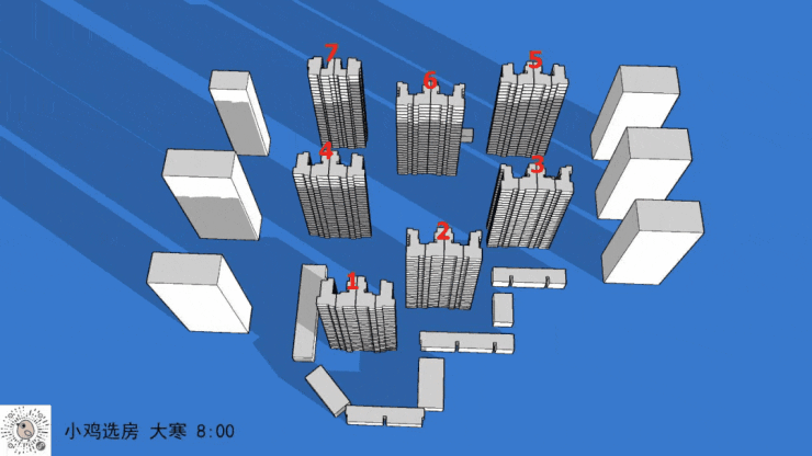 根据日照建模评测数据,5、6#整体的日照比较中规中矩,低楼层日照平均在3h左右,这两幢楼位于整个项目的最北侧,不可避免的会受到其他楼栋的一些遮挡。