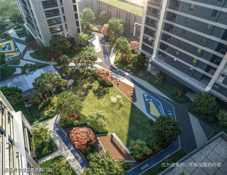 与常见的一字排列方式不同,项目3幢楼栋呈“品字形”的围合式布局,内部空间更是打造了层次丰富的“一心一环三节点”的园区景观,儿童乐园、环形跑道等场地,能满足多龄段业主对休闲空间的需要。