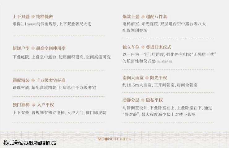 新规户型八大升级,以独门独梯、独立车位、阳光平权、动静分层、超高空间使用率的上下双叠奢尺大宅,实现家庭全生命周期的居住理想。