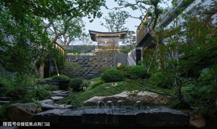 『立体下沉庭院以垂直维度突破二维庭院的局限,强化了行进中视点的更迭与景深变换。大尺度景观窗精准框景远山,结合层叠的高差操作,塑造空间的仪式性与自然张力。亭的设置以仰视视角重构主峰山势,赋予庭园以山岳意象的崇高性。』