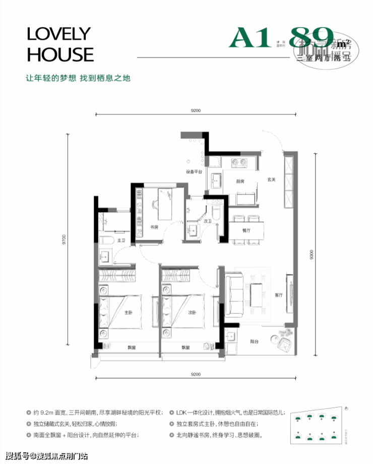 南面全飘窗+阳台设计,向自然延伸的平台;北向静谧书房,终身学习、思想破圈。