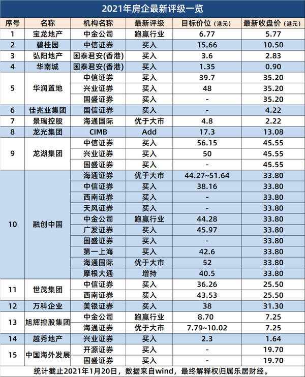 据不完全统计,今年以来,共15家房企获得机构买入/跑赢行业/优于大市评级,包括佳兆业、旭辉、中海、弘阳、碧桂园、龙湖、华润置地、世茂、越秀地产等,其中景瑞控股、中海是首次获得以上评级;融创获得9家机构评级,在15家房企中居首。