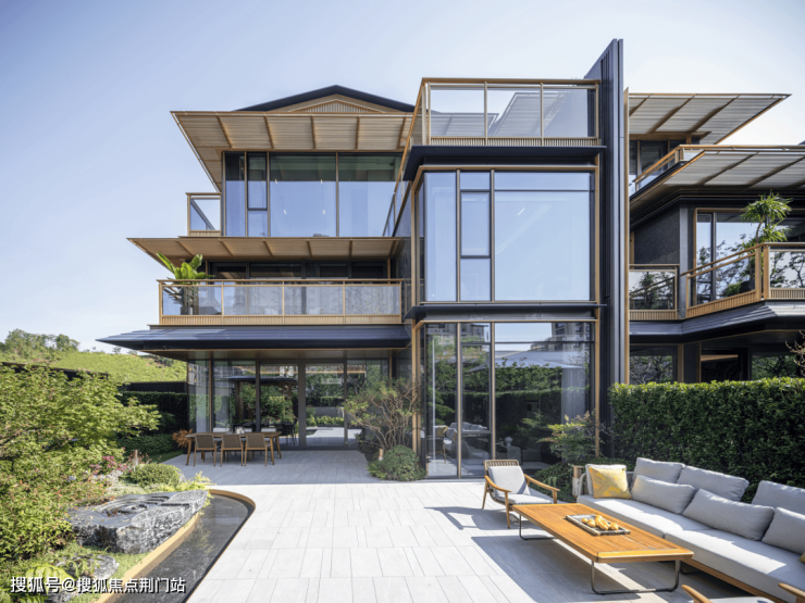院墅的立面材质选择石材、铝材、玻璃为主体,辅以仿木纹涂料并嵌入发泡陶瓷线条,通过木作样式与木质质感的饰面表现,增添构造的层次感与品质感。