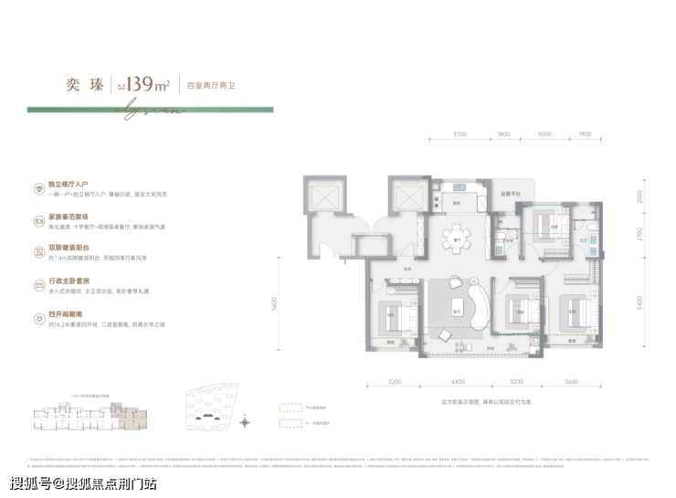 建面约139㎡四房两卫户型:堪称改善家庭的终极选择:独立梯厅入户,类一梯一户设计,尊享私密与静谧四开间朝南;约14米奢阔面宽,阳光满室铺展;餐客一体宽境,约7米阔绰开间,满足大家庭聚会需求;南面双联阳台,瞰景晾晒两全,兼具生活与诗意。