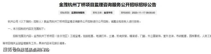 近日,阳光招采平台上发布了“金茂杭州丁桥项目监理咨询服务公开招标公告”,也印证了这一点,招标范围内容就是金茂丁桥项目的工程监理。