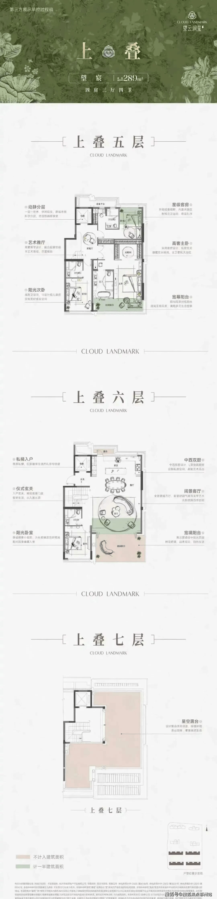 建面约289方上叠户型,一层阳台、主卧套间连通,阳光次卧、星级客房,还带家庭厅;二层宽境大露台、餐客厅、厨房等,可打造洄游式欢聚场……