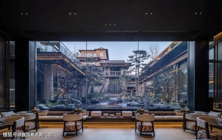 大尺度观景窗借景远山,竖向标高差强化仪式感,庭院中亭子的仰视视角塑造主峰山势巍峨之感。