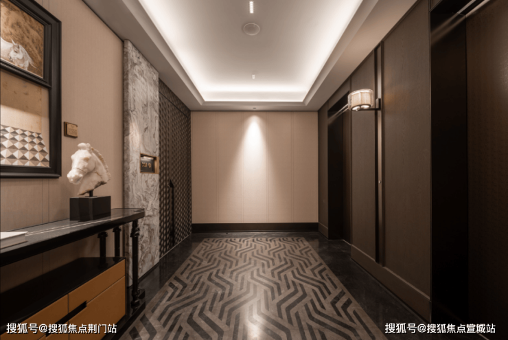 两梯两户+双开门贯通电梯,实际使用起来有近似“两梯一户”居住体验。巨大的电梯厅面积将近13㎡,精装奢石和木纹铝板。