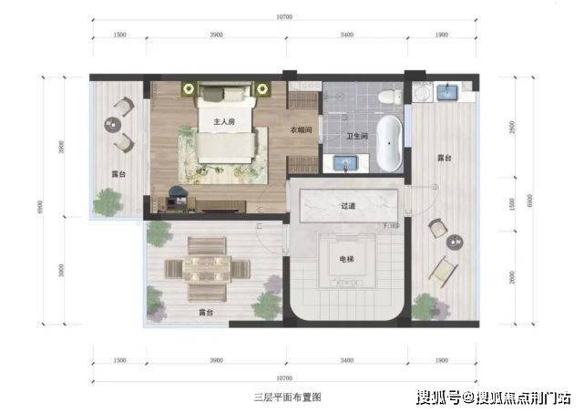三层:尊崇主人层● 全功能主人层设计,10.7米大开间豪华套房布局,独享尊贵● 东西南3大环景露台,将大幕院景、阳光星辰尽收眼底,一境天地宽