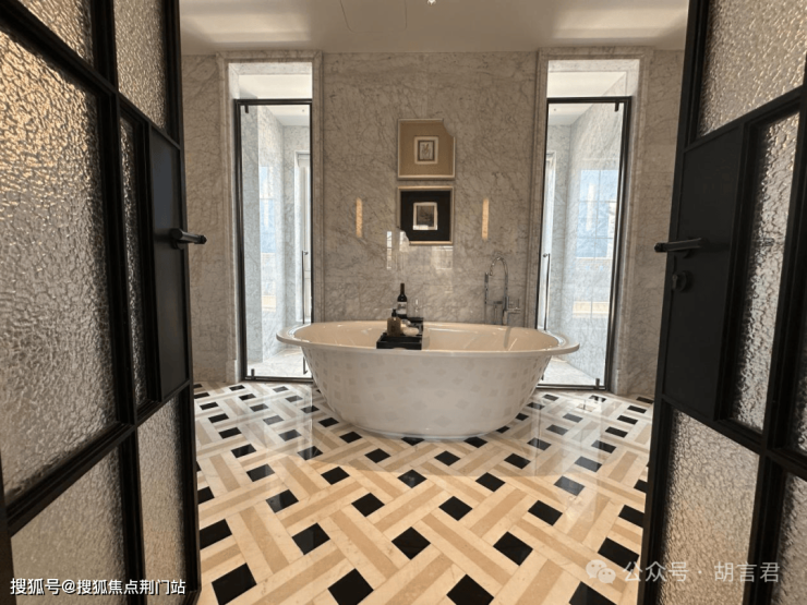 卫生间做的不大,但很有仪式感,双台盆分置门后的两侧。