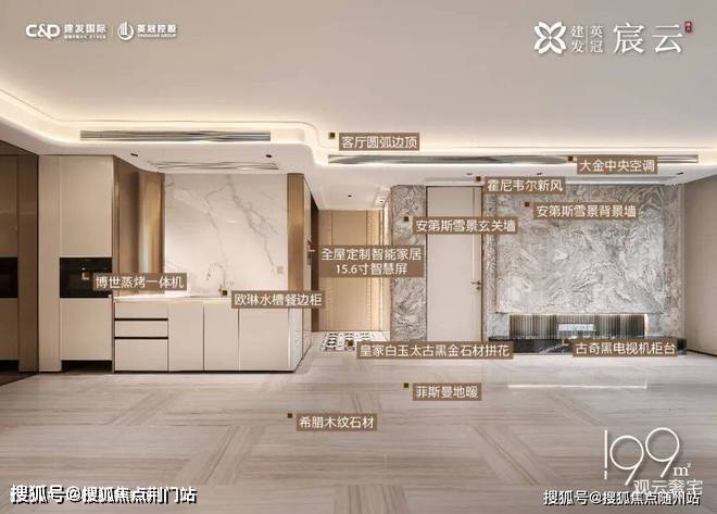 室内方面,客厅通铺大理石,室内采用大面积皮革、木饰面,与以往建发的产品不同的是,宸云在精装修上用了更多的石材,用更多自然的花纹元素来点缀各个空间,轻奢而不过时。