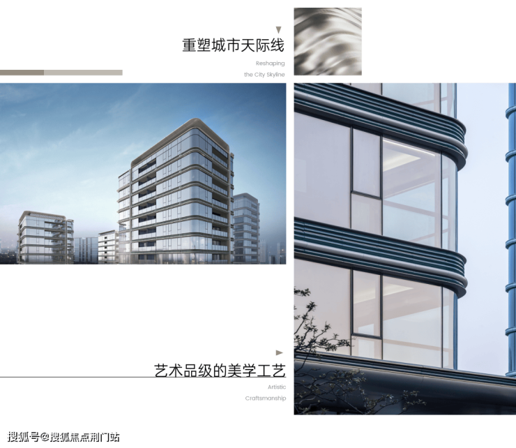 标志性的曲面屏设计通过取消转角结构柱,实现270°观景视野,达成视觉的无界延伸。大面积陶板材质的运用,以其比铝板更丰富的光影、比石材更灵动的质感,与香槟金线条共构出立面的温度与深度。