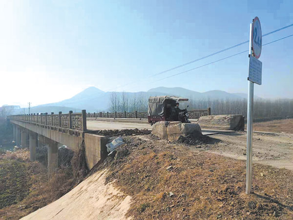 记者昨日在现场看到,桥北设置了两个限宽墩,限宽2.4米,限宽墩已被挂得满是伤痕。两个限宽墩中间放置着一块厚厚的钢板,当地村干部介绍,限宽墩建设处的路面与桥面已经出现坑槽,用钢板盖着方便车辆通行,不时有一台台小车从这里经过,车辆都开得很慢。