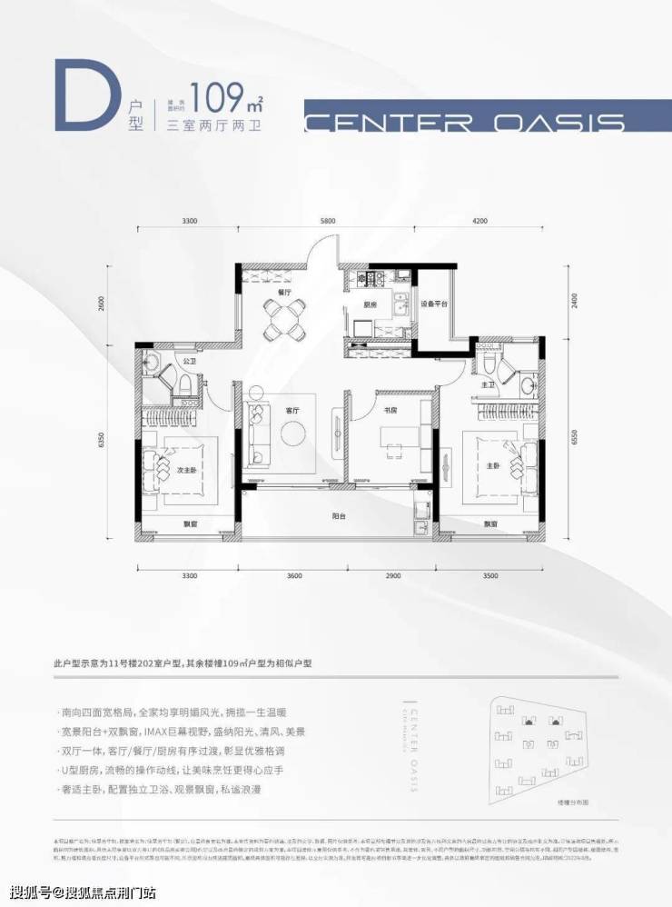 109方虽同为三房两厅两卫中间套,但却设置成了四开间朝南,3个房间+客厅全部南向设置,面宽超13米。