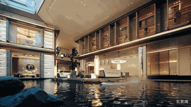全新迭代的下沉式庭院会所藏隐于园境之中,电梯门一开,就是别有洞天:琼楼玉宇映缀湖山,飞檐翘角衔接清光,「站立的西湖」如一帘绚丽的瀑布飞流直下,流淌成满室的月色清辉,这既具东方建筑的雅致风骨,又有三面湖山一面城的格局气韵。