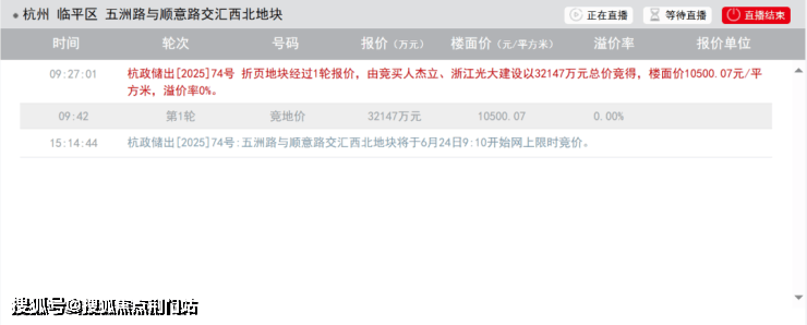 东湖新城单元LP111204-02地块过1轮报价,由竞买人杰立、浙江光大建设以32147万元总价竞得,楼面价10500.07元/平方米,溢价率0%。