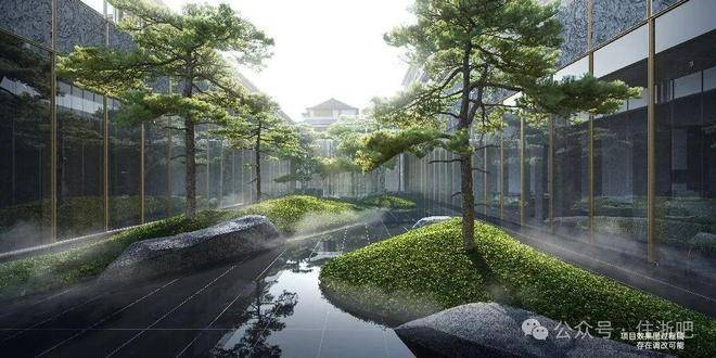 春棠雅韵府深研宋式造园手法,取意山水画卷,提炼名画中的山峦、流水、飞瀑、水榭、苍竹等元素,结合杭州的人文自然底蕴,运用现代手法营造“画里寻居,诗中筑园”的优雅意境。将城市喧嚣隔绝于外,山水真意糅融于内,传递现代东方韵律。