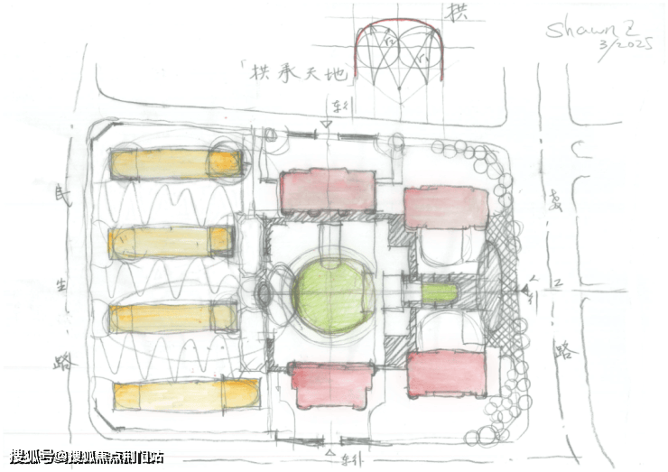 高层南北立面上的拱券线条,与拱宸桥“三孔薄墩拱驼峰桥”的整体设计彼此呼应,展现中国传统文化中“天地人”三才并立的稳定格局。