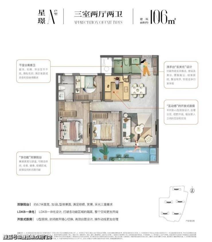 客厅面宽也从常规的约3.4米扩展到了约3.6米,让公共空间更加明亮宽敞。双联宽景阳台达到了约6.7米,晾晒空间更大、视野更好,还能作为瑜伽、健身等活动空间。