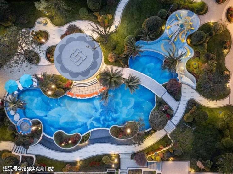 中央水景是曲线设计的,配了棕榈树,有点度假酒店的感觉。还专门做了一个浅滩儿童嬉水区,夏天孩子可以直接在里面玩水。
