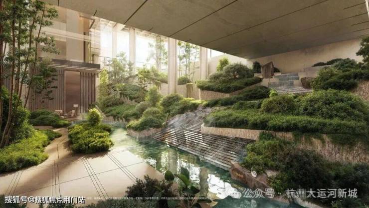 以运河为脉、引水入园的理念贯穿全园,总面积约900㎡的水景网络,将水静、流、跌、映的不同形态融入生活的各个角落,呈现“傍水而居”的诗意生活。